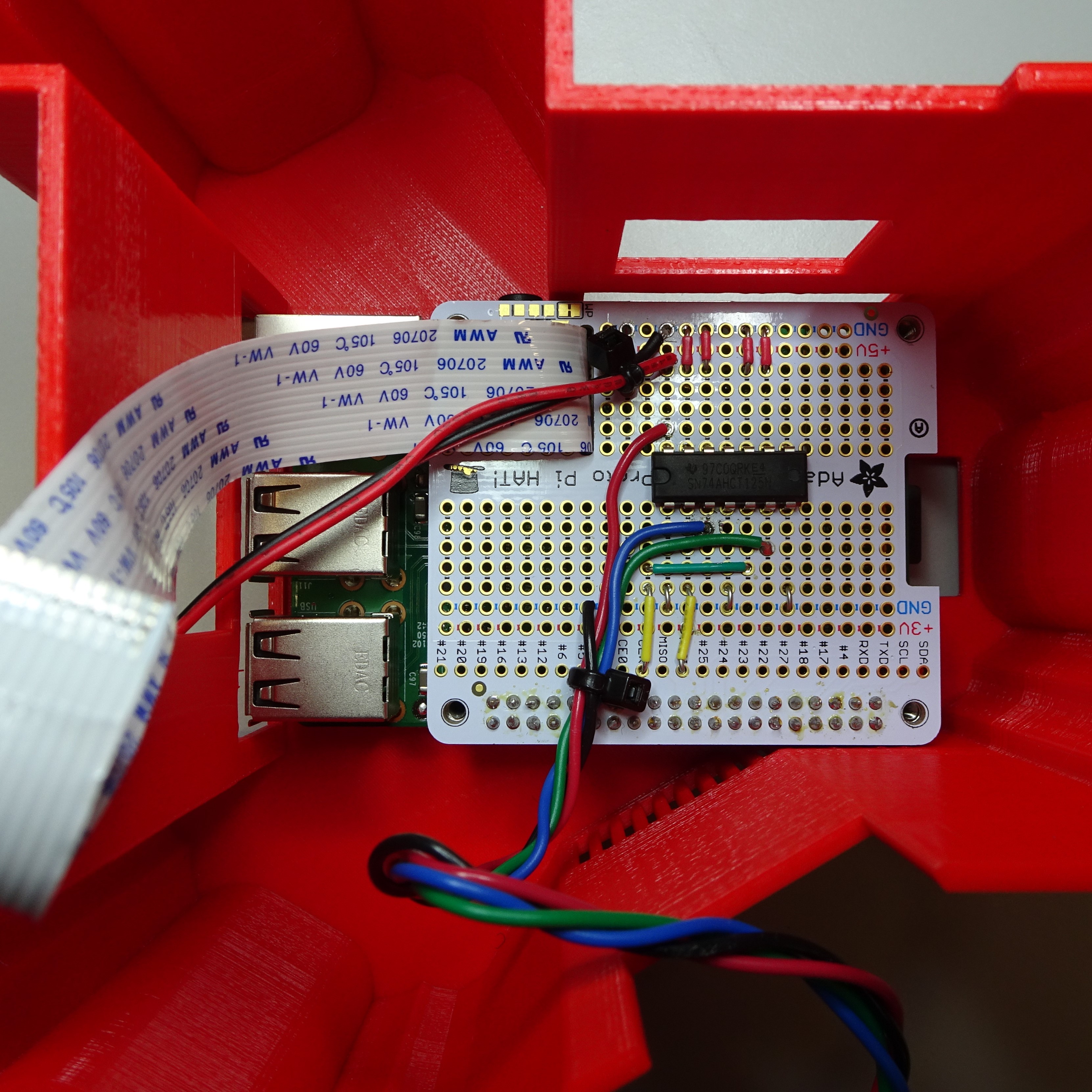Push the perma-proto board on top of the Raspberry Pi. Make sure the GPIO pins align with the header on the perma-proto board. The camera ribbon cable should fit through the slot. Secure it in place with four M2.5x12mm standoffs.