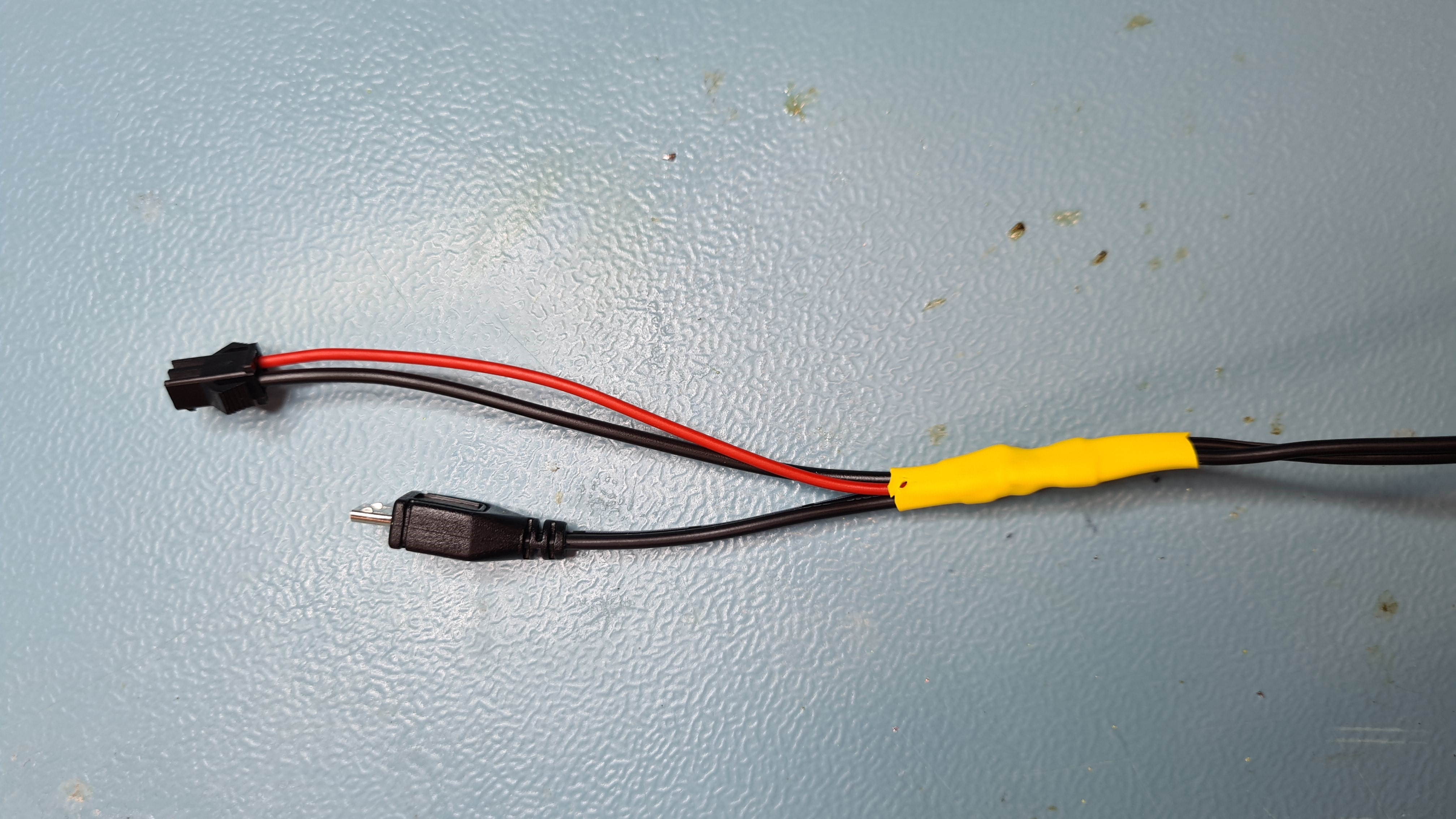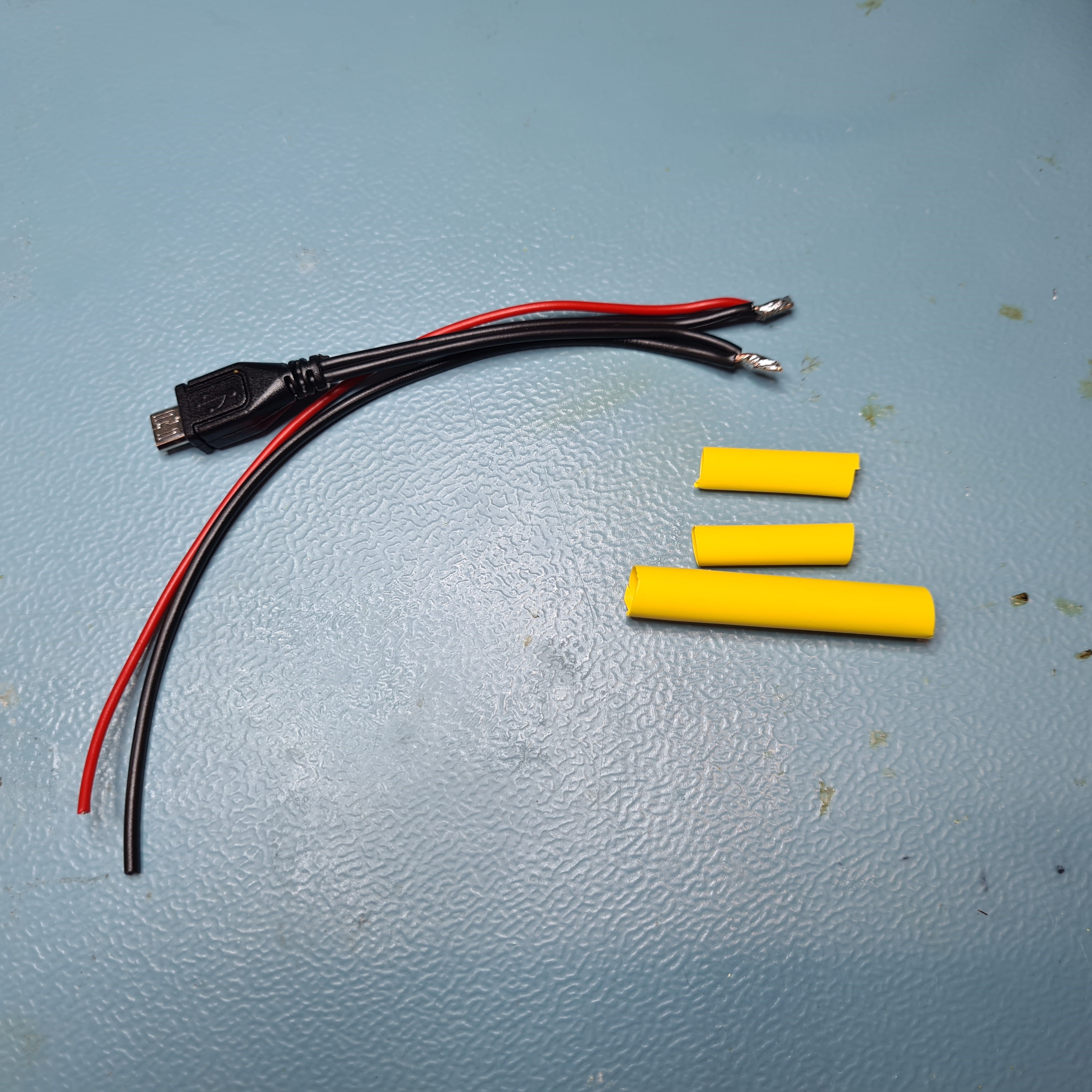 Carefully separate the two cables using a craft knife on the longer end of the Raspberry Pi power supply cable for approximately 5cm and strip both wires using a wire stripper. Push the longer 6.4mm heat shrink tube over both wires and the two shorter 4.8mm heat shrink tubes over each of the wires.