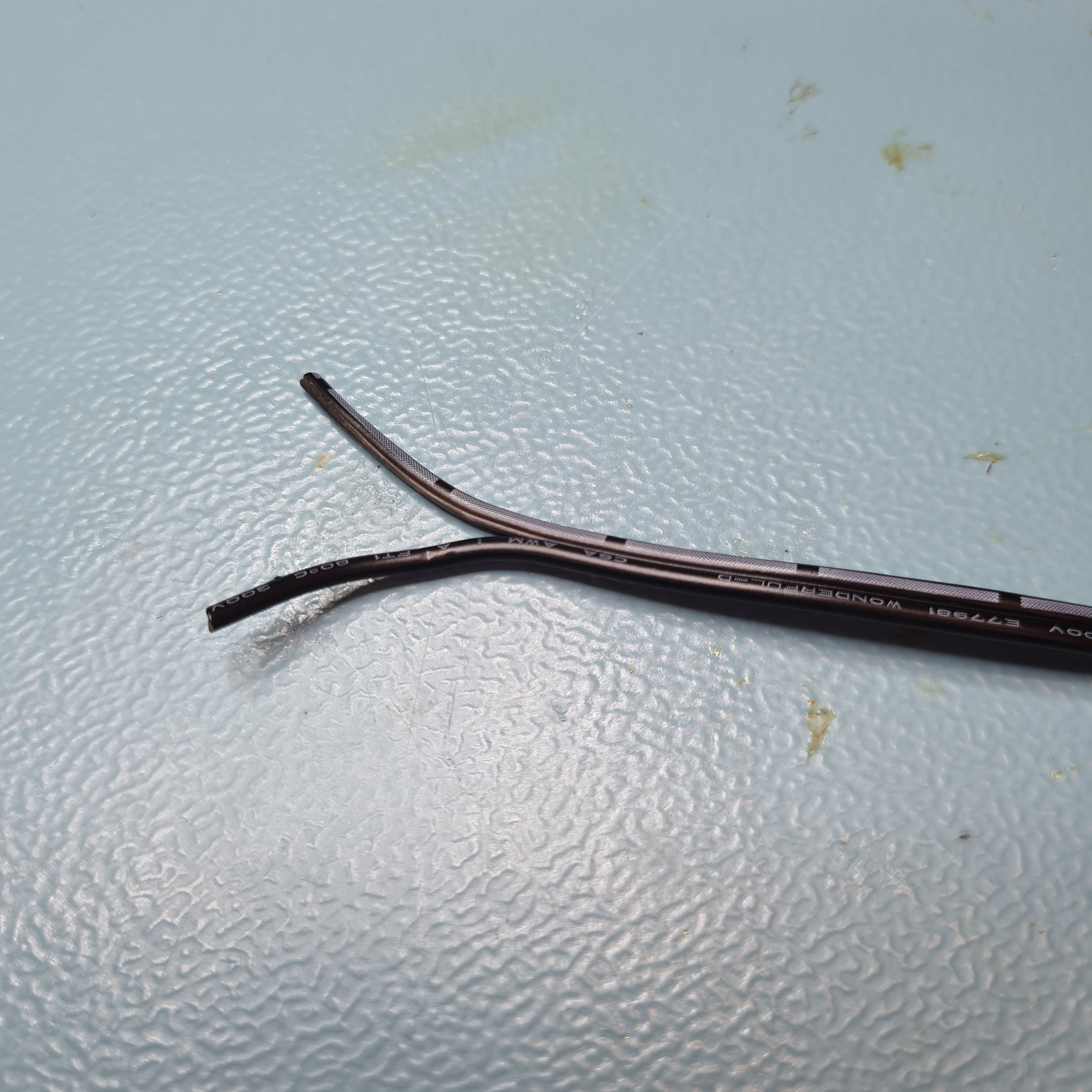 Carefully separate the two cables using a craft knife on the USB plug cable for approximately 3cm and strip both wires using a wire stripper. Check which wire is positive and negative. On this official Raspberry Pi power supply cable, the wire with long lines printed on is the negative wire.