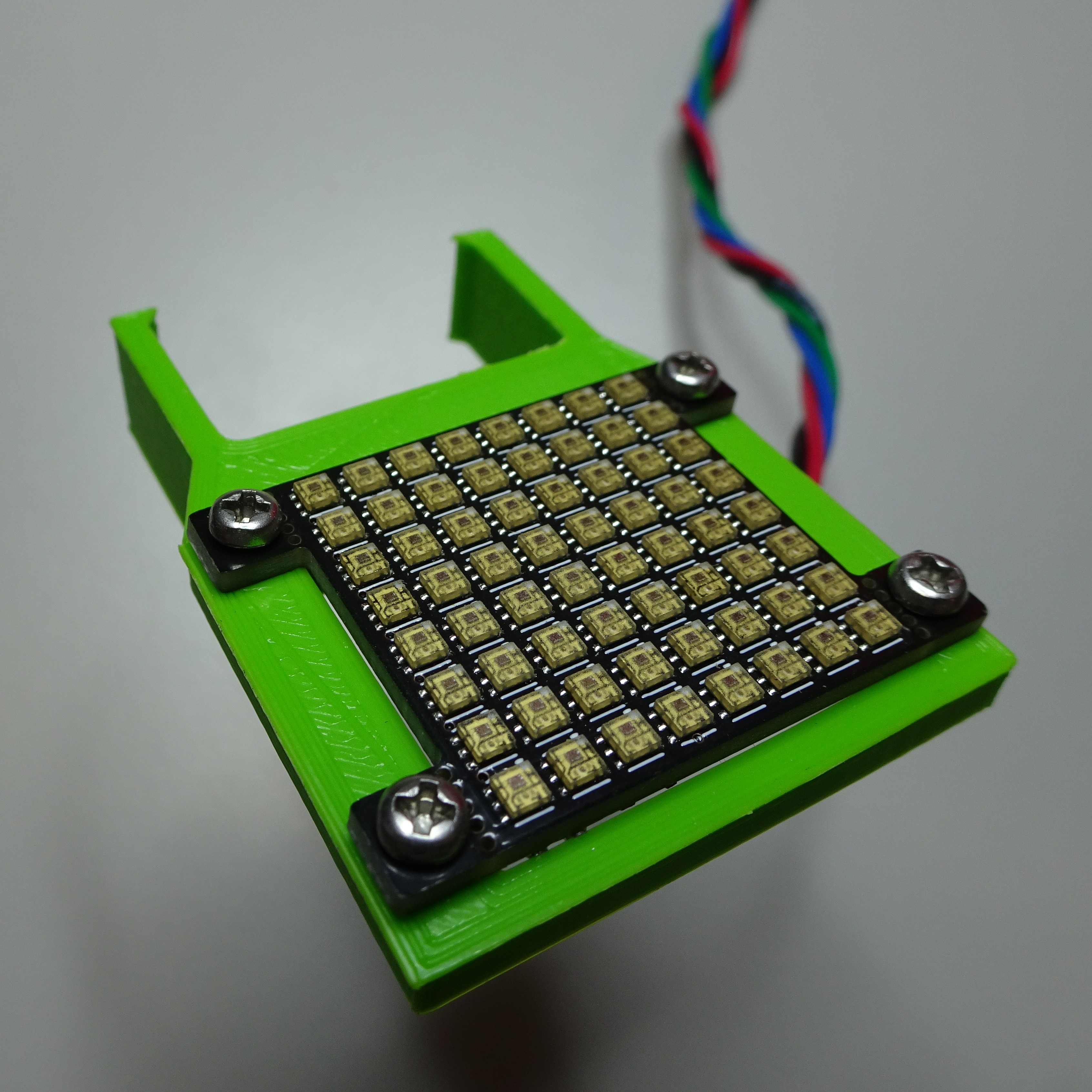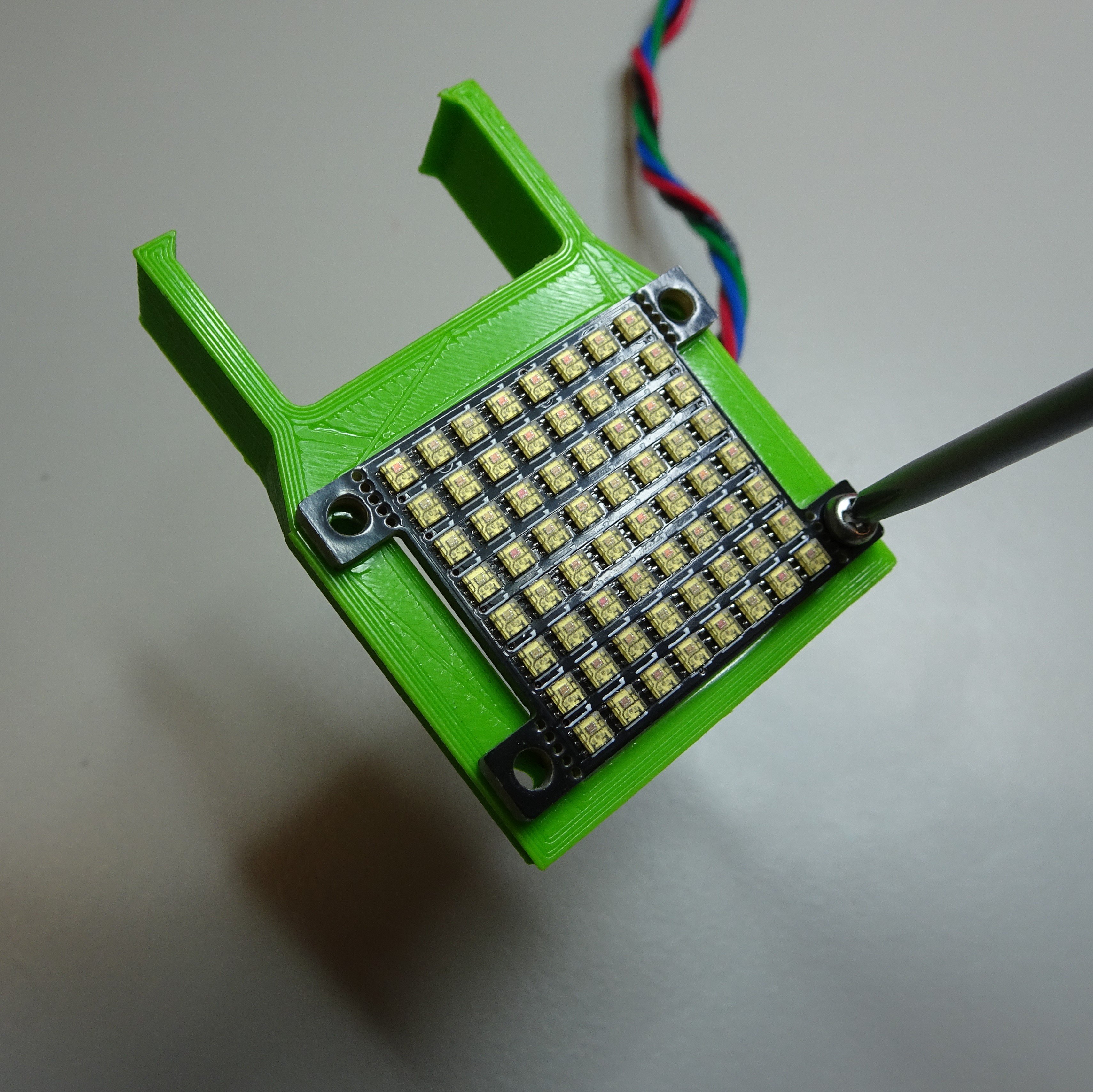 Pass the Adafruit 3444 LED grid through the LED array holder. Secure it in place with four M2.5x8mm screws using a 2mm hex screwdriver.