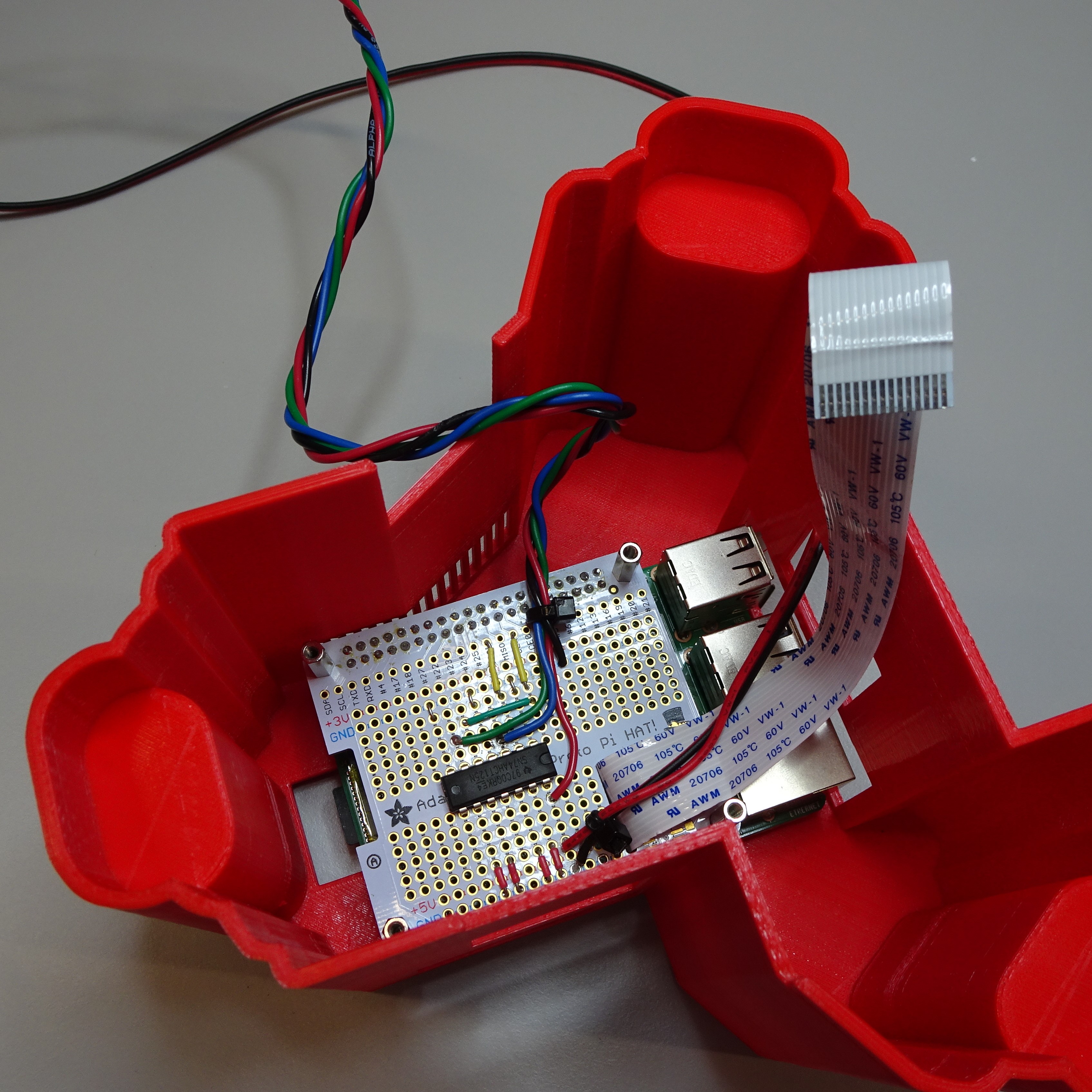 Push the perma-proto board on top of the Raspberry Pi. Make sure the GPIO pins align with the header on the perma-proto board. The camera ribbon cable should fit through the slot. Secure it in place with four M2.5x12mm standoffs.
