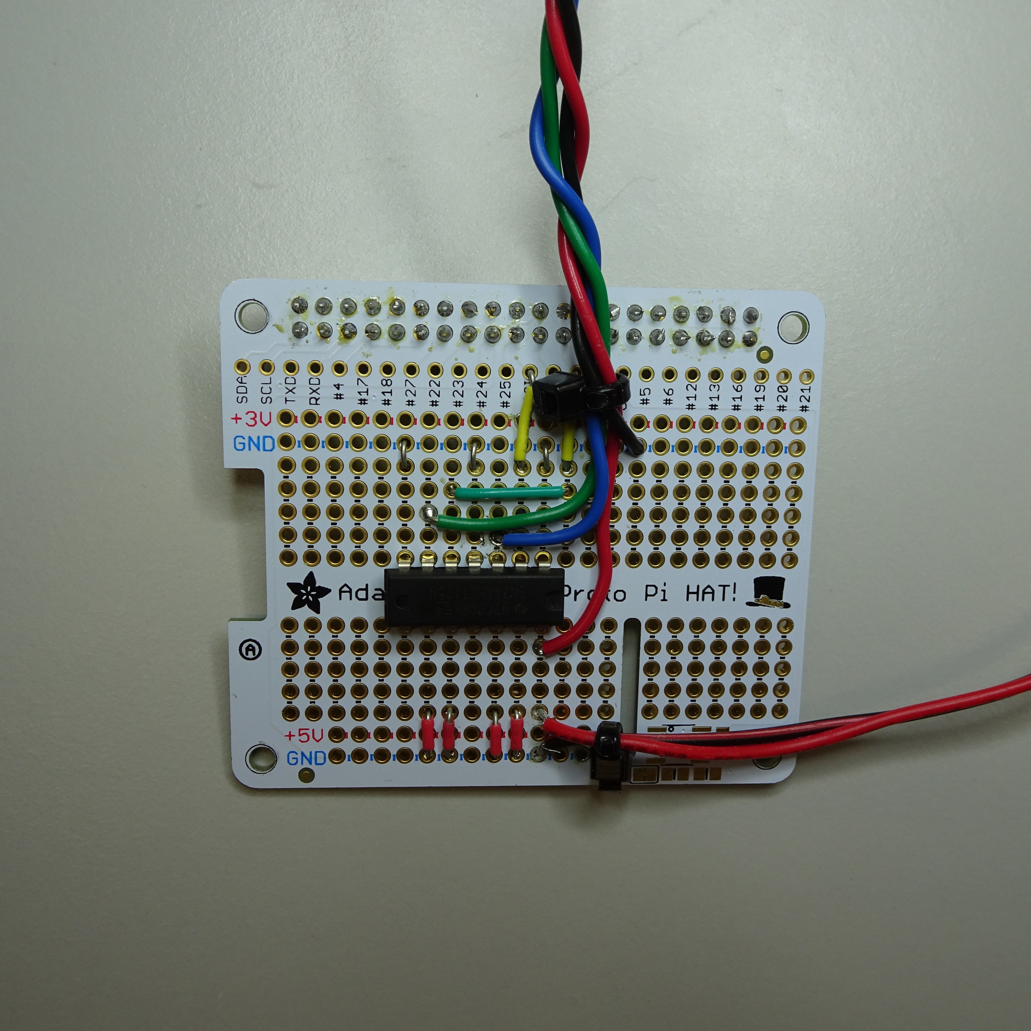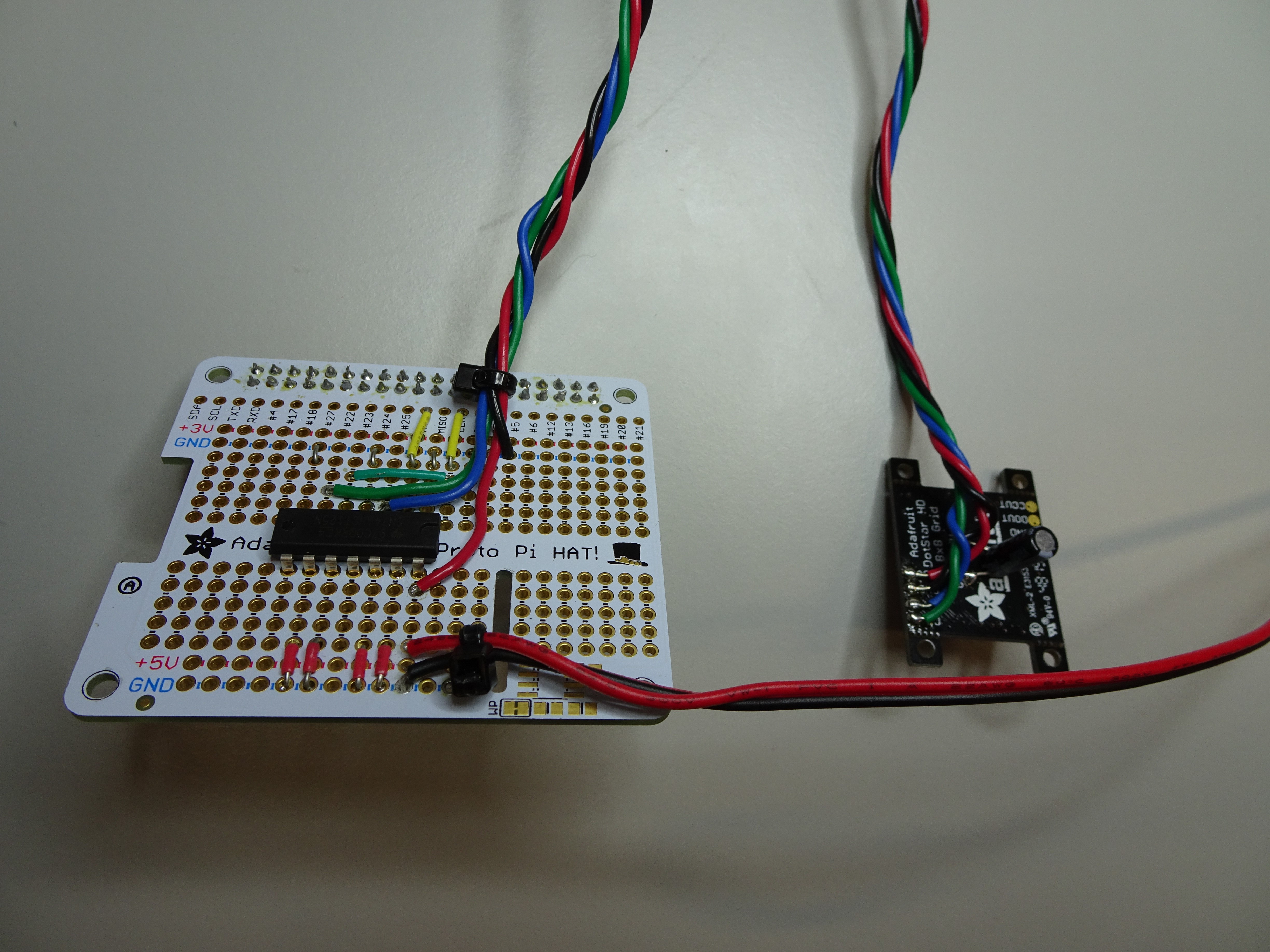 Solder the Adafruit 3444 LED grid to the perma-proto board with the 74AHCT125 chip using a soldering iron and solder. You will need to power the LED grid, we recommend using a USB cable with a high power (2A) USB plug for convenience.