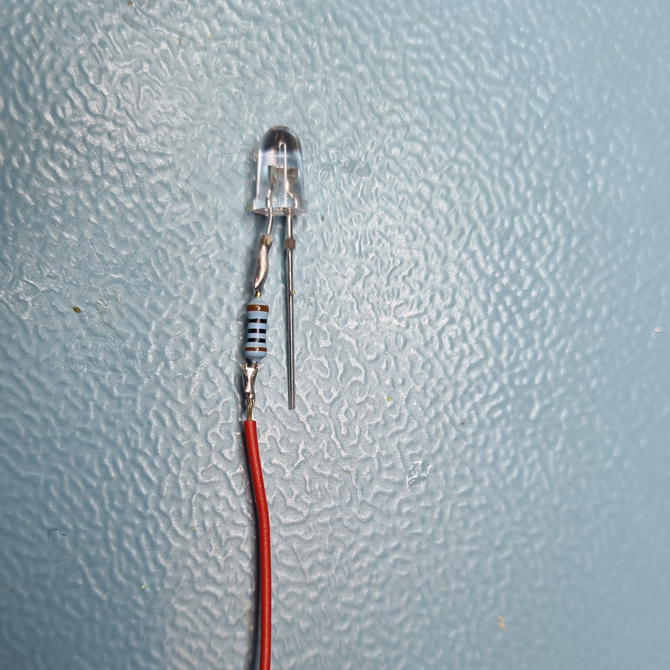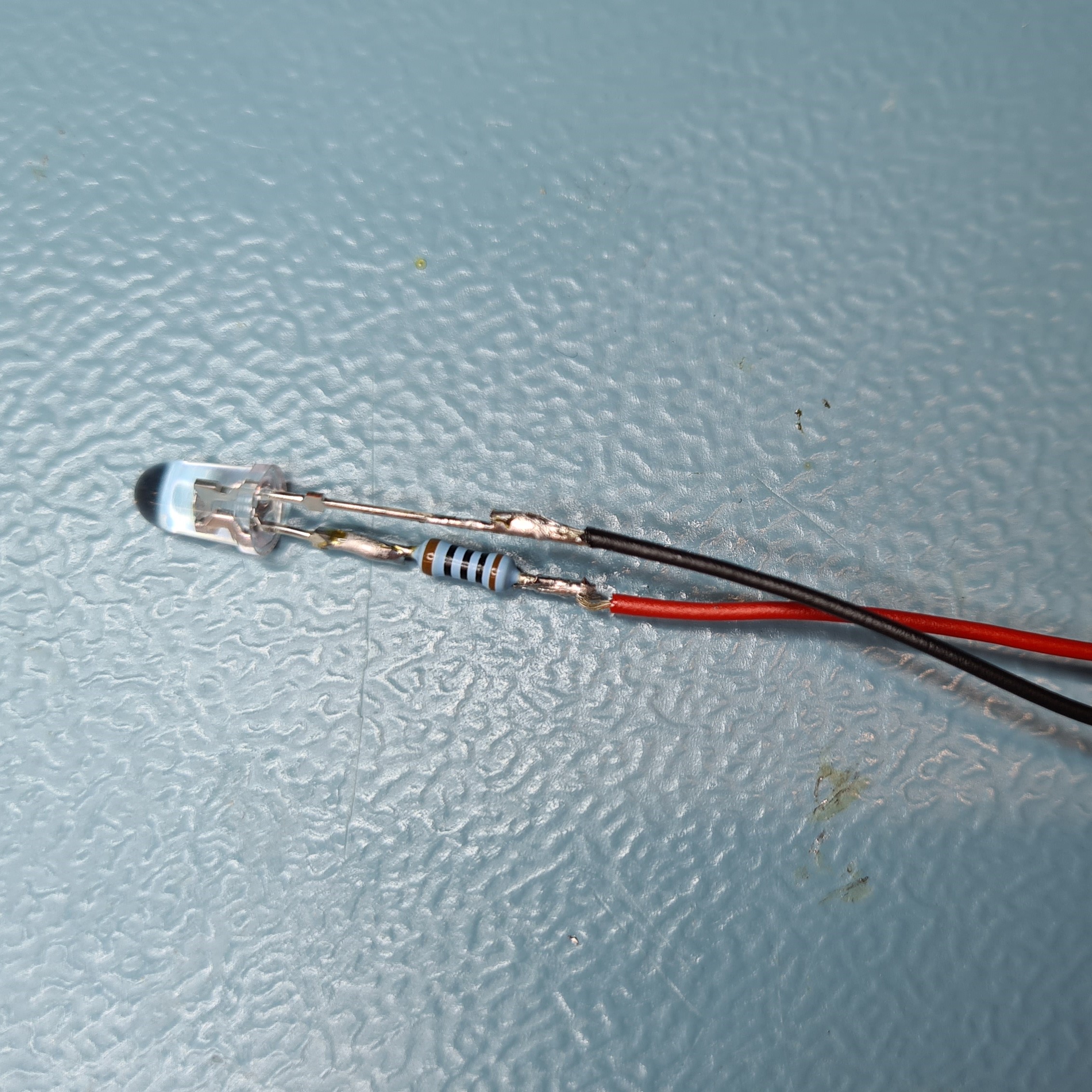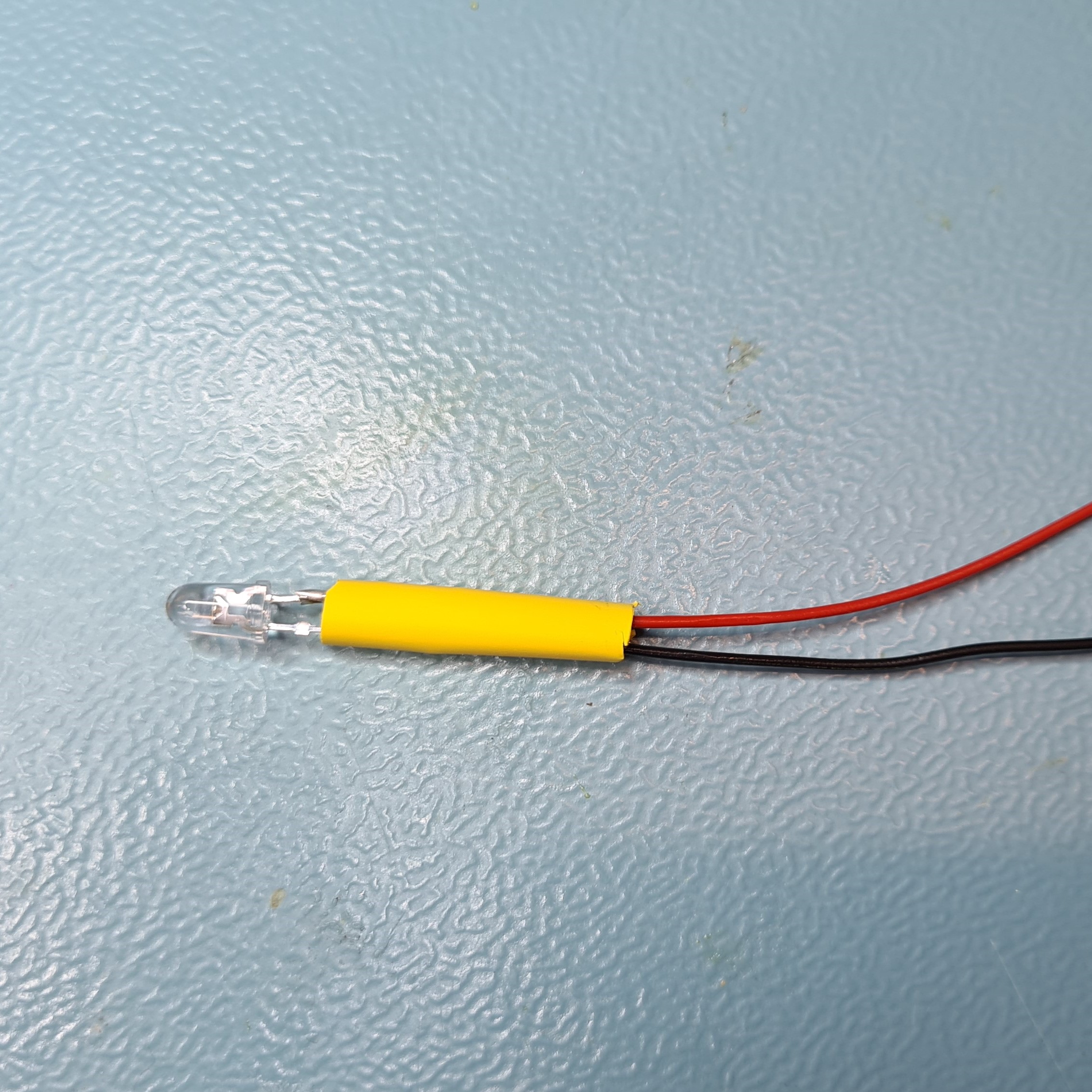 Cover each leg of the LED and resistor with some 3.2mm heat shrink so that the exposed metal cannot short-circuit. Use a heat gun to heat the 3.2mm heat shrink on both legs.