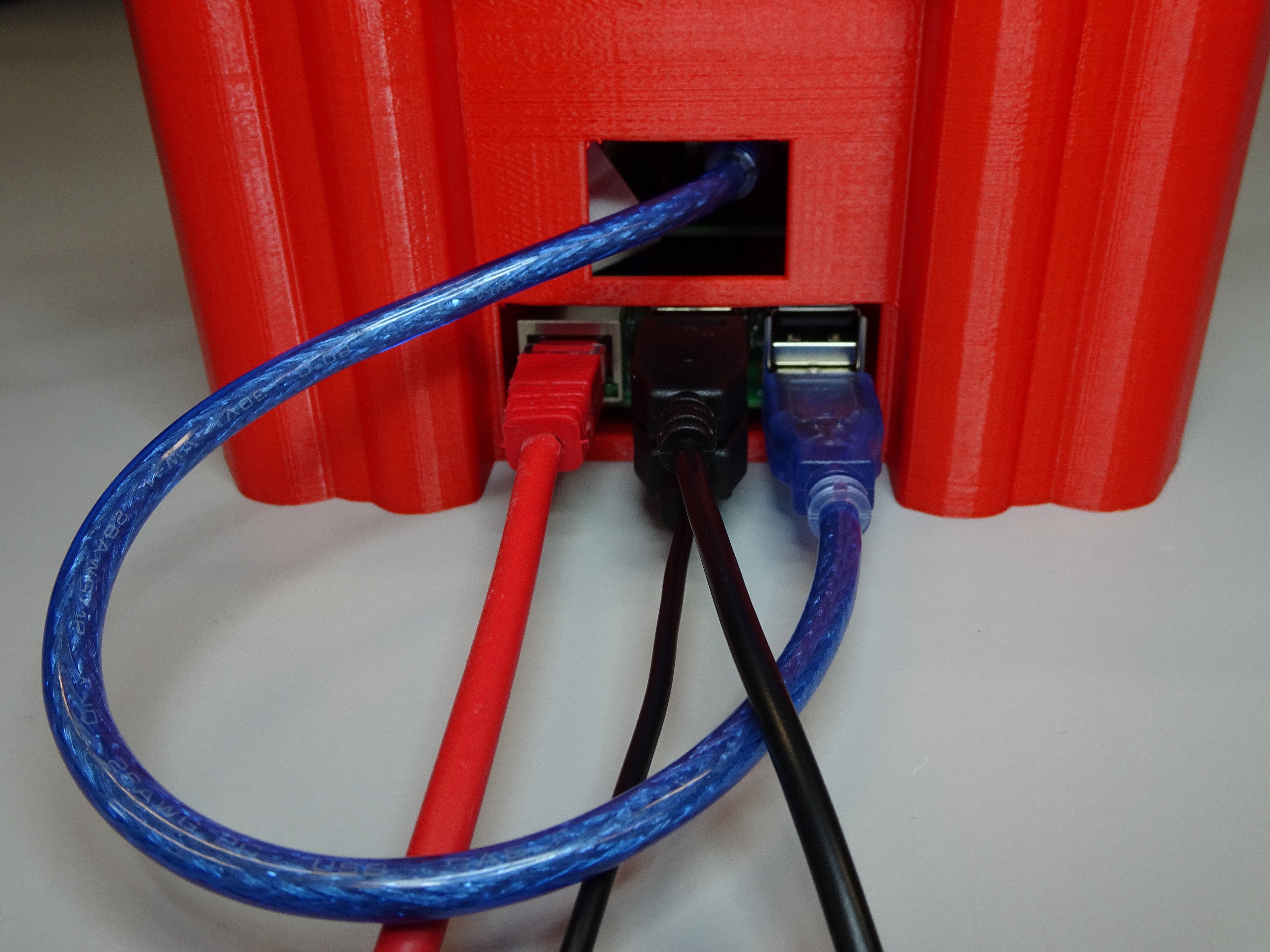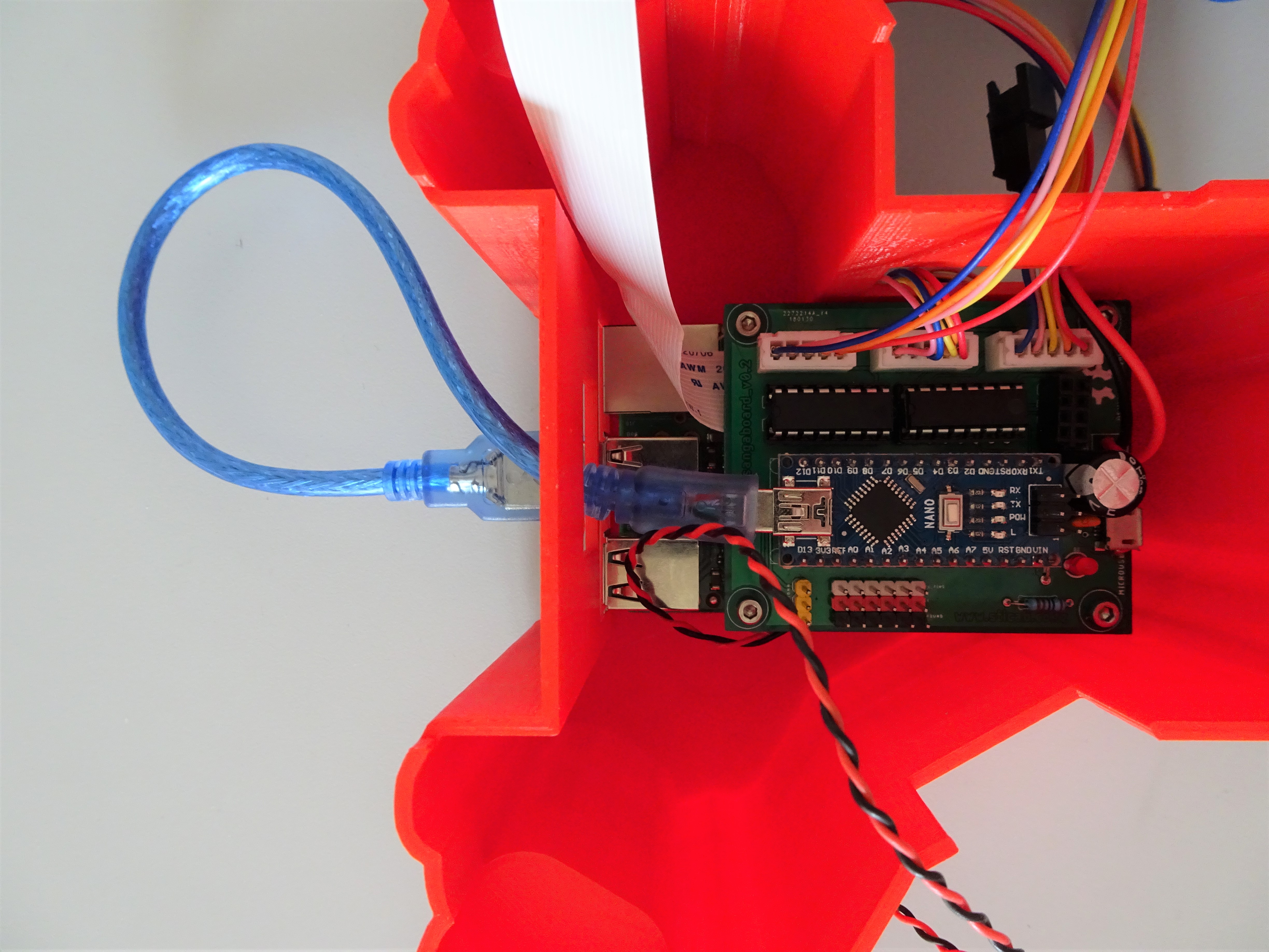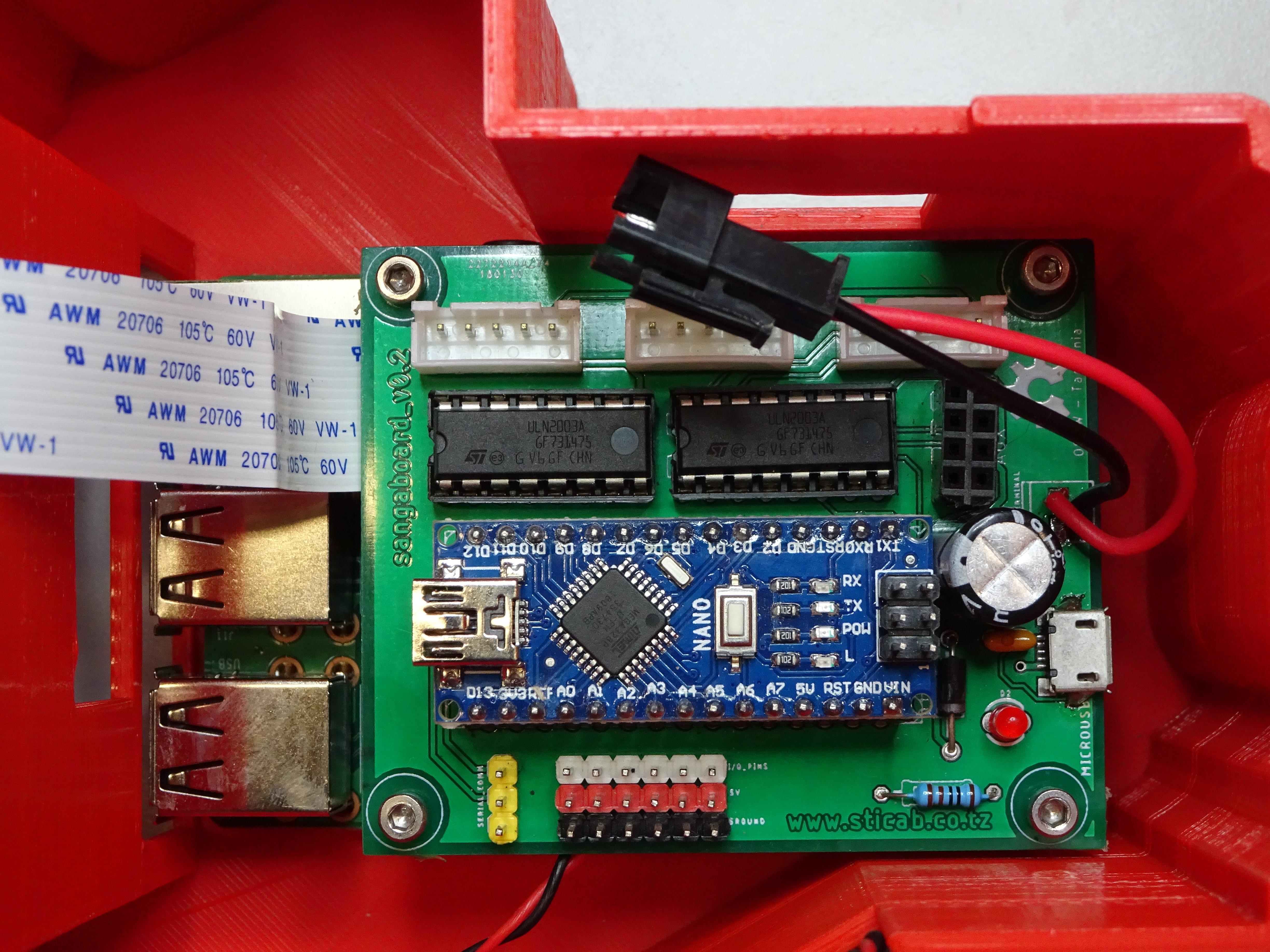 The Sangaboard connects to the Raspberry Pi by USB cable. There is a special window for the USB cable to pass through.