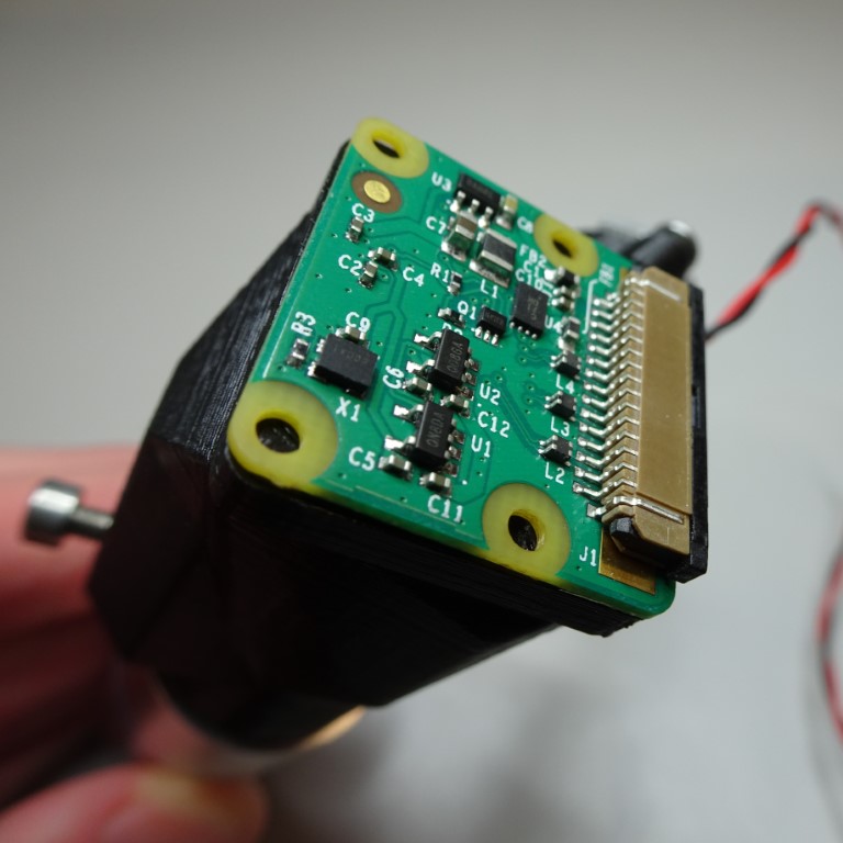 Attach the Raspberry Pi camera v2 to the bottom of the reflection optics module casing. Put the camera cover over the top. Secure everything in place with two M2x6mm screws using a 1.5mm hex screwdriver.