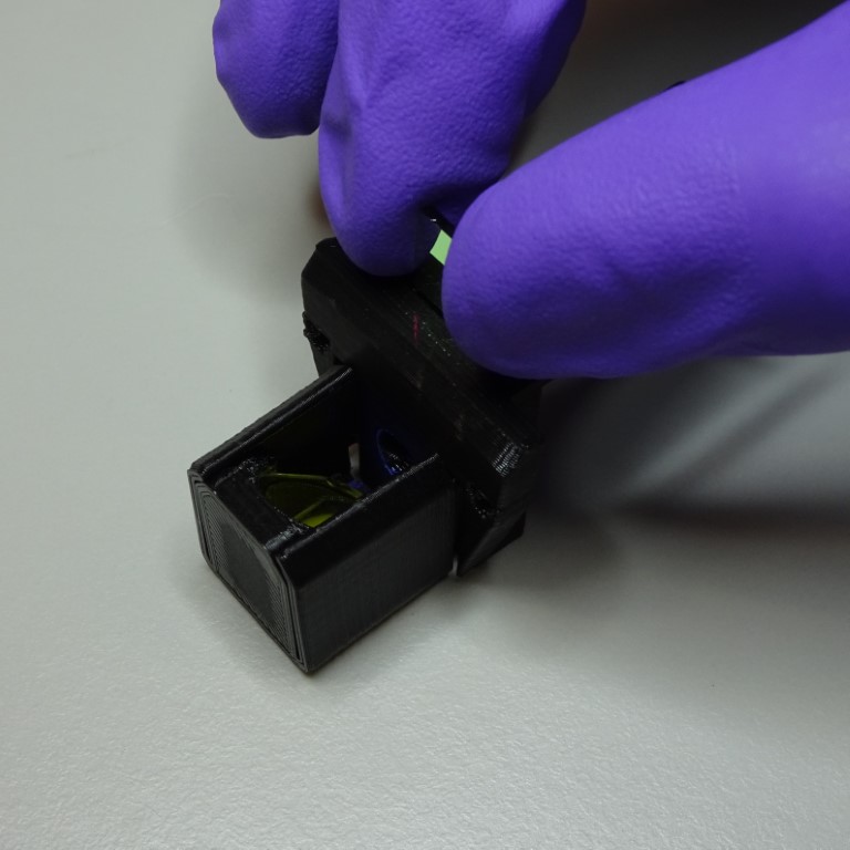 Push the emission filter into the bottom of the filter cube. It should be tight but be careful not to break the glass filter. You might need to file down the slot if there are printing errors.