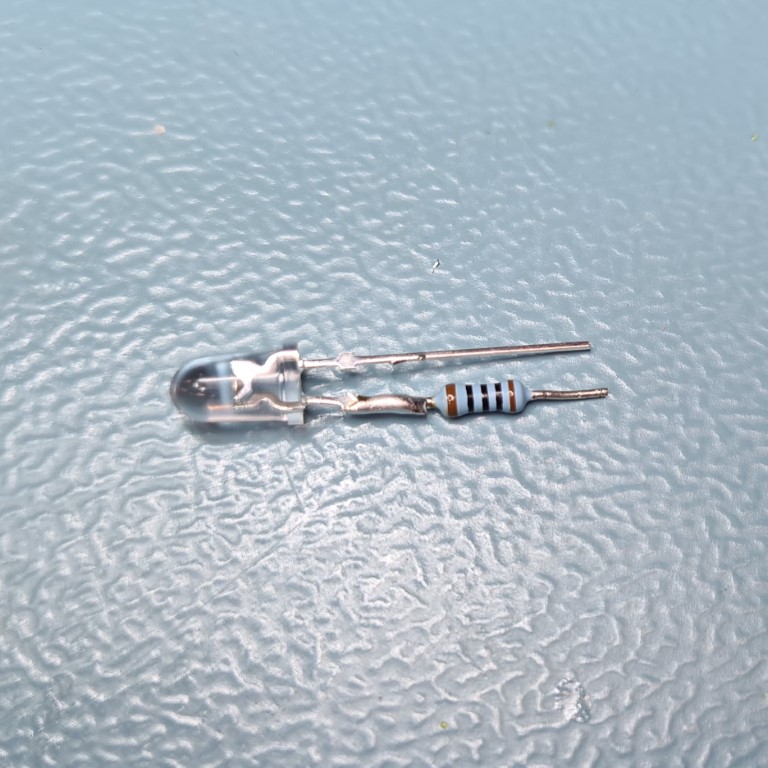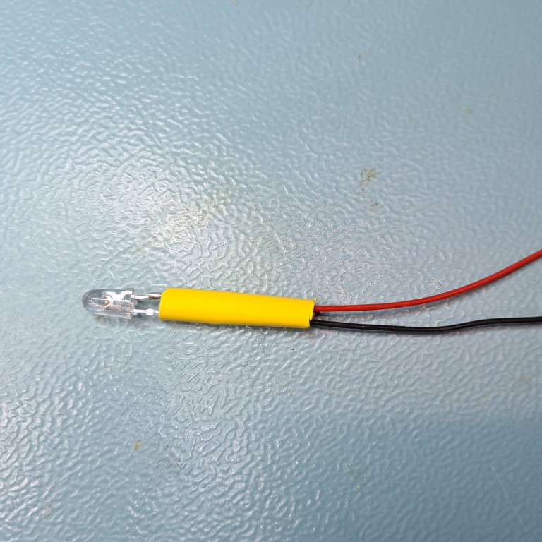 Cover each leg of the LED and resistor with some 3.2mm heat shrink so that the exposed metal cannot short-circuit. Use a heat gun to heat the 3.2mm heat shrink on both legs.