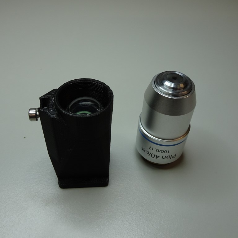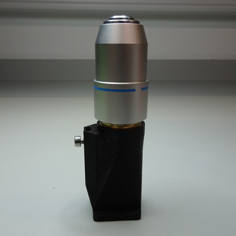 Screw the objective lens into the top of the transmission optics module casing. Be careful to screw it in straight, to avoid cross-threading.