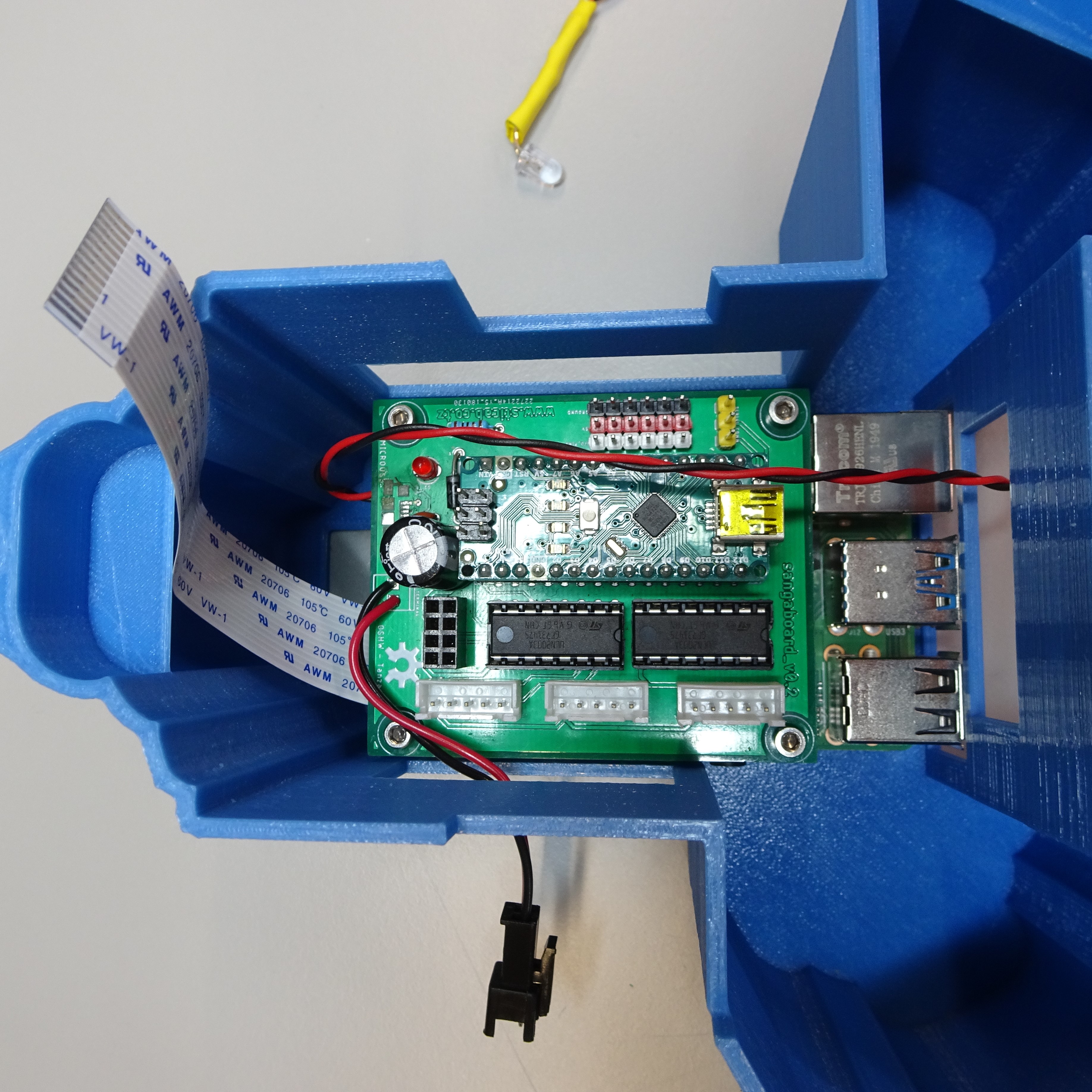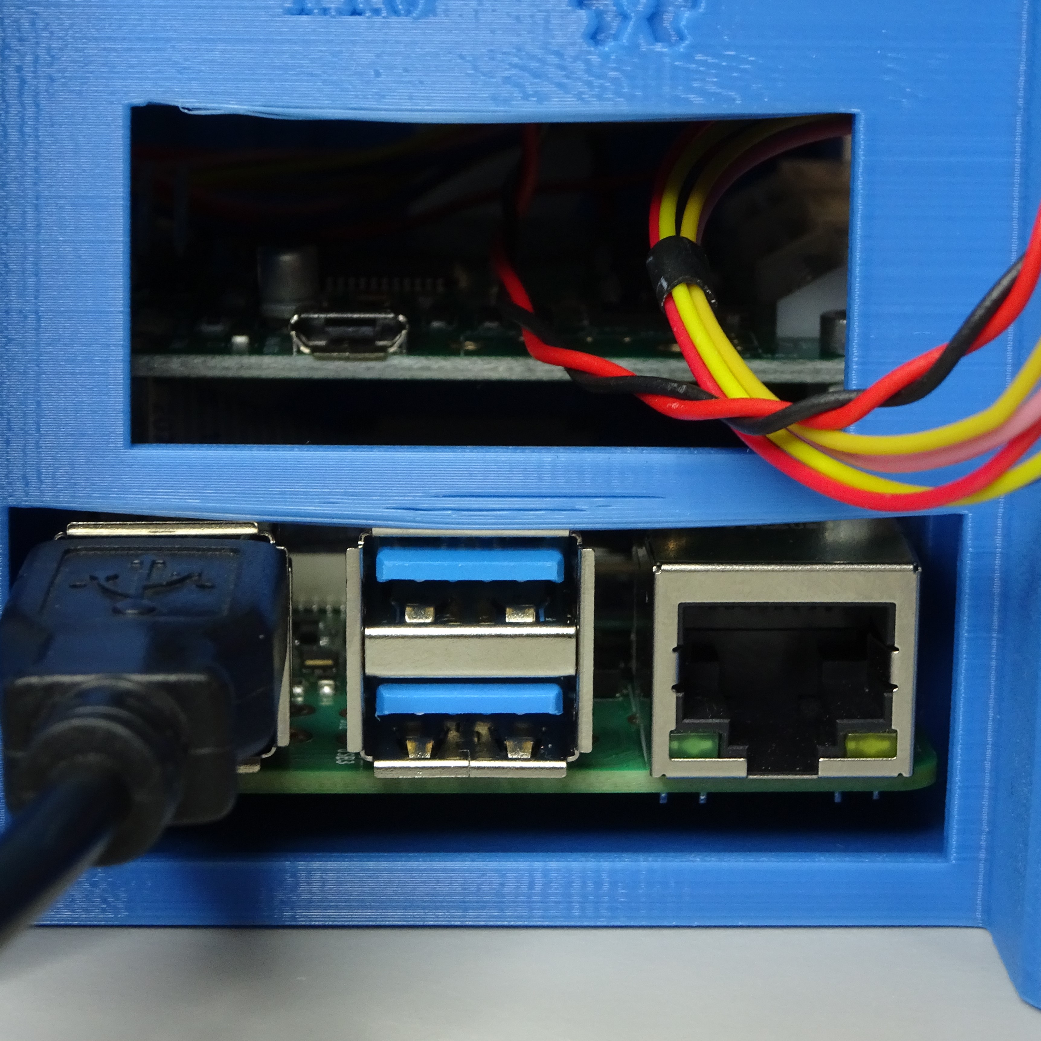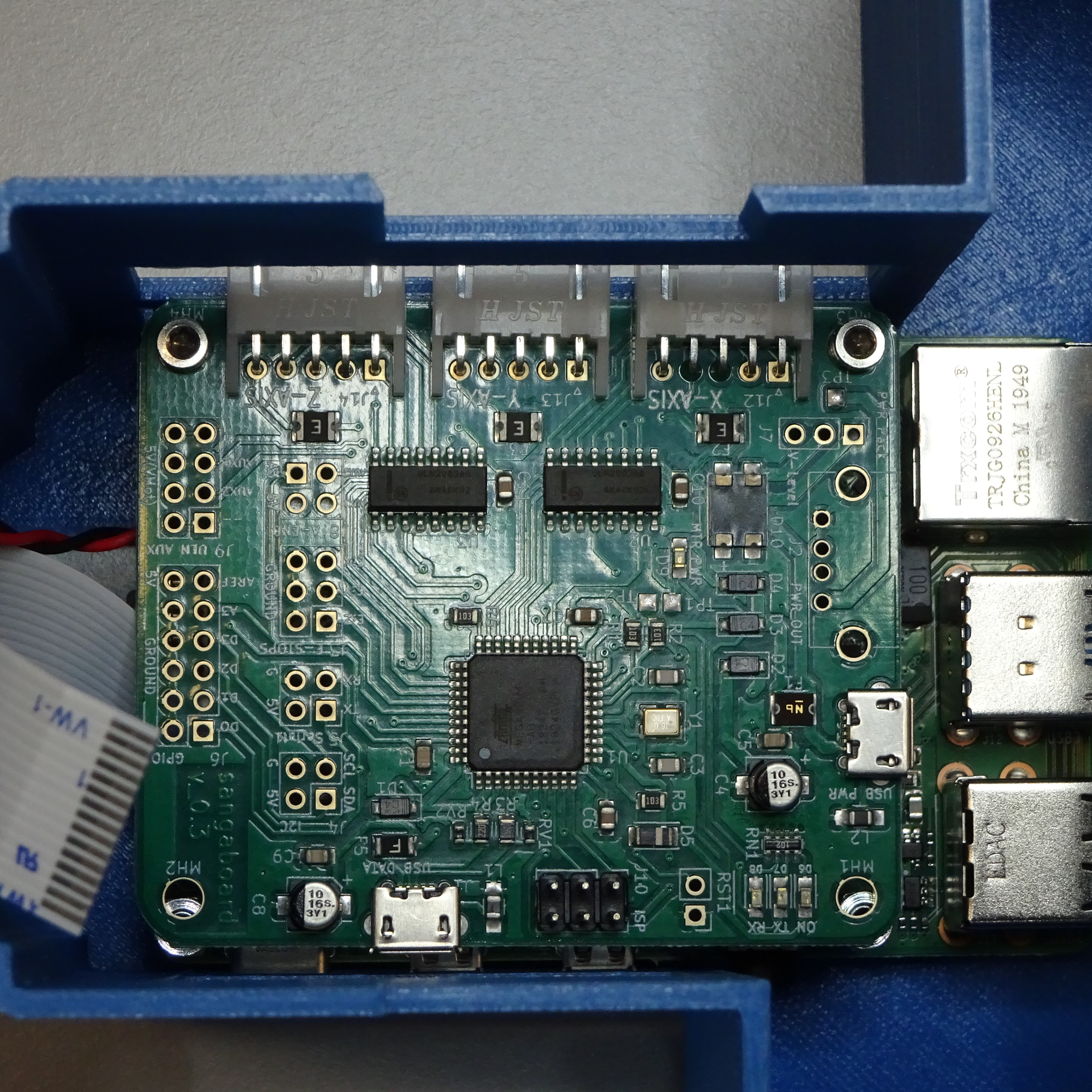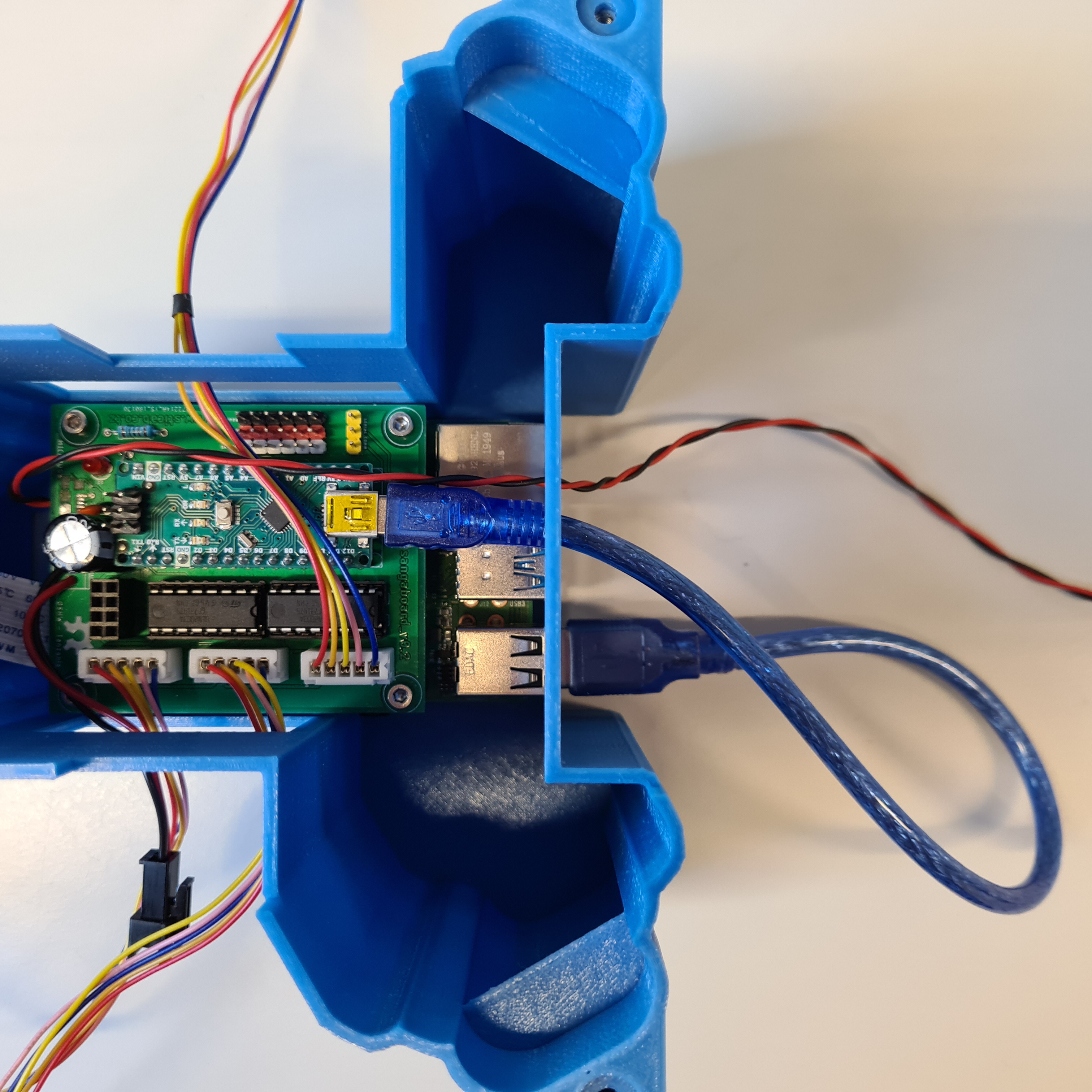 The Sangaboard connects to the Raspberry Pi from the Arduino USB port by USB cable. There is a special window for the USB cable to pass through.