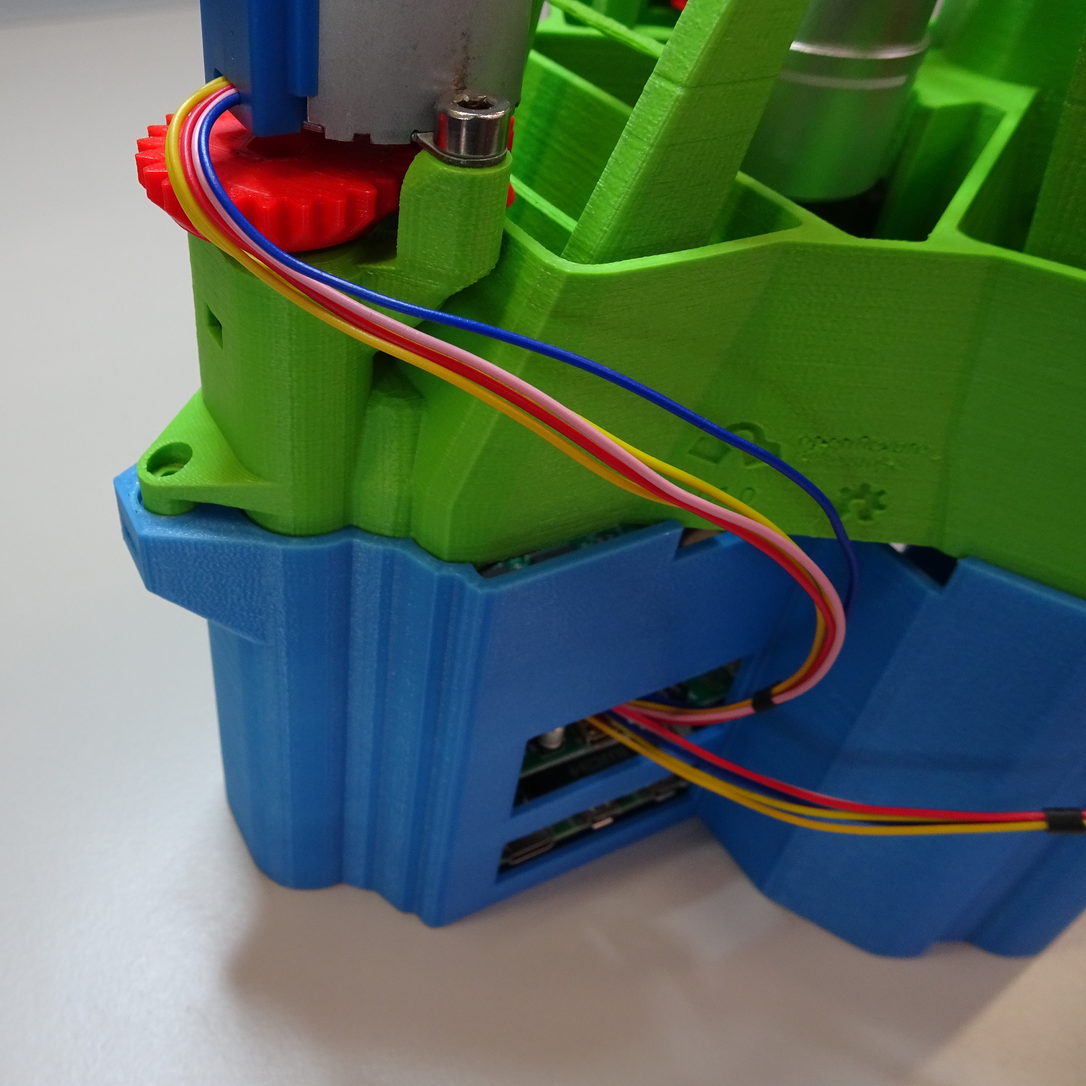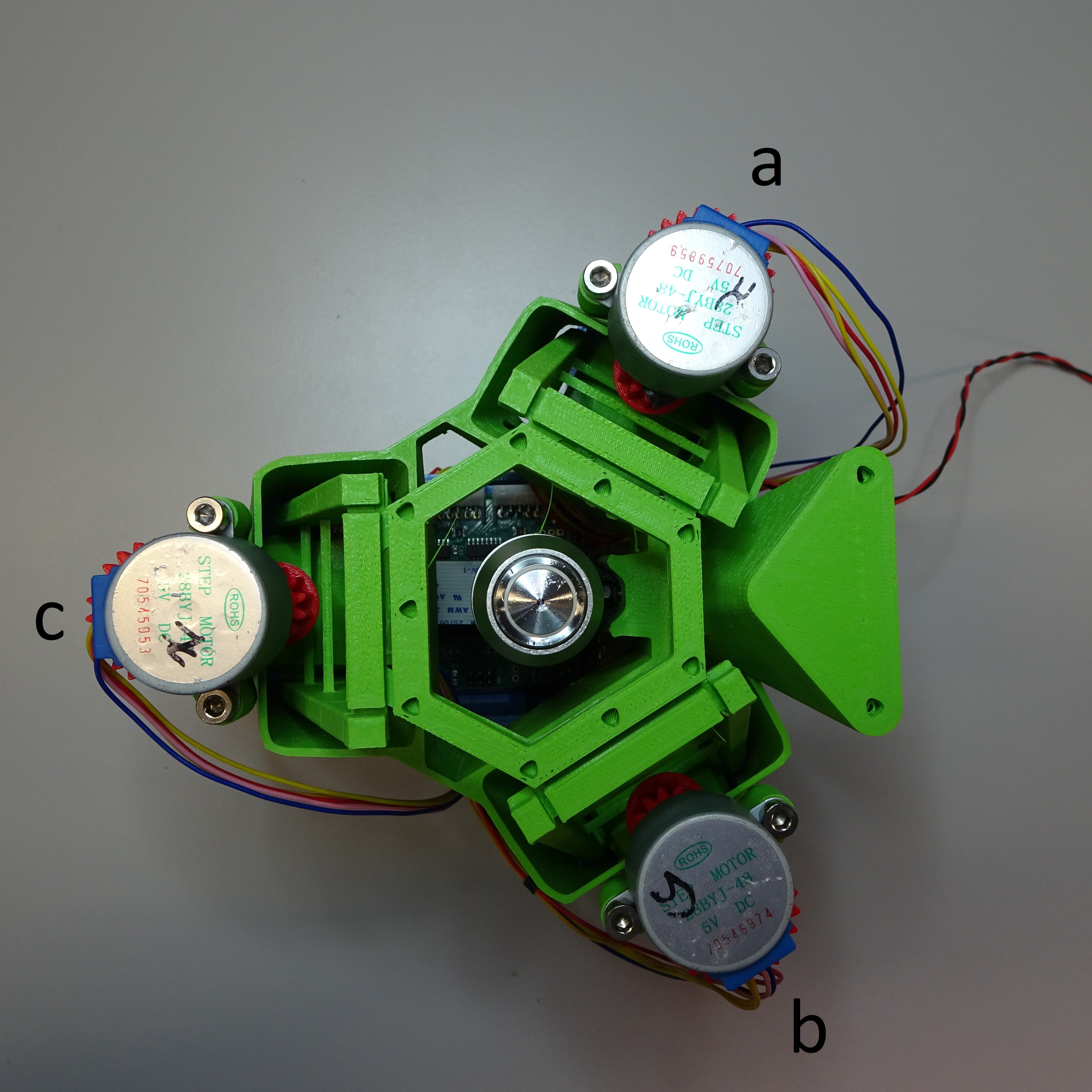 Plug in the motors. Motor cables from motors a and b can enter though the window in the side of the case and the motor cable from motor c can enter through the window at the back or the side. The correct order to plug in the motors can be seen here: