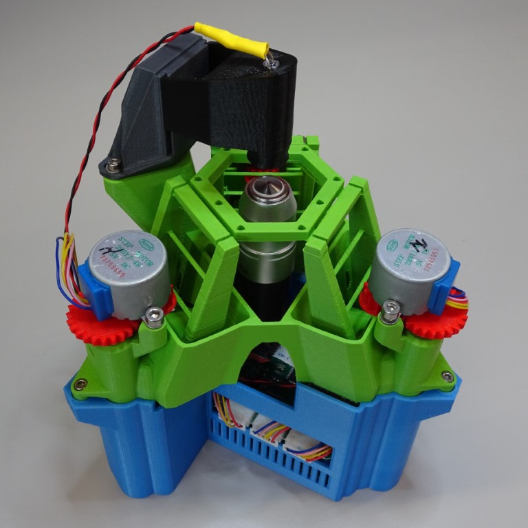 The delta stage is a 3D printed x-y-z translation stage. As the optics do not move it is particularly suited to more complex imaging (phase, reflection, fluorescence microscopy). There are two standard ways to build it, with either transmission illumination or reflection illumination. The motorised translation stage, which forms the main body of the microscope, is the same for both, and so swapping between the two configurations is possible by replacing the optics module. There are also some optional components linked at the bottom of the page.