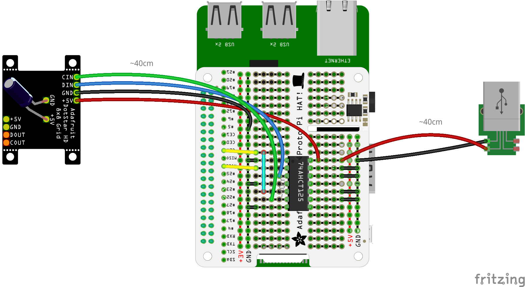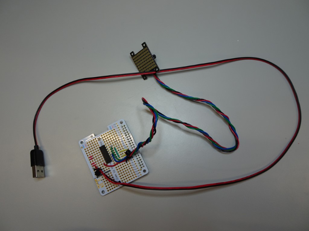 Solder the Adafruit 3444 LED grid to the perma-proto board with the 74AHCT125 chip using a soldering iron and solder. You will need to power the LED grid, we recommend using a USB cable with a high power (2A) USB plug for convenience.
