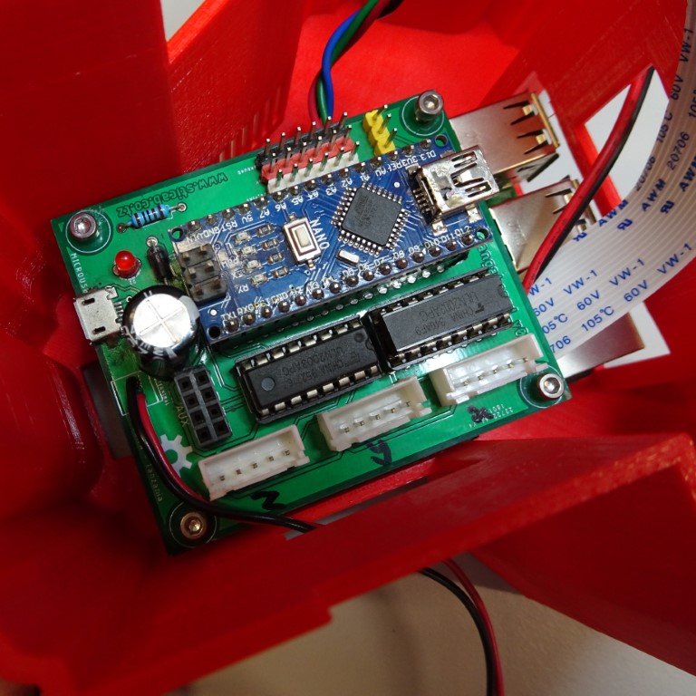 The Sangaboard (currently v2 only) should sit on top of the standoffs, and can be secured with four M2.5x7mm screws using a 2mm hex screwdriver.
