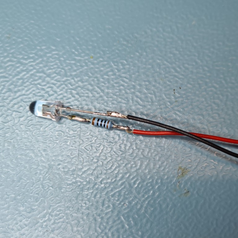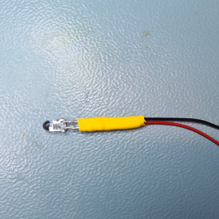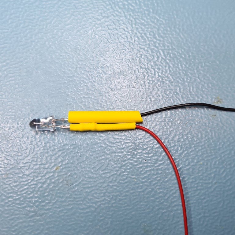 Cover each leg of the LED and resistor with some 3.2mm heat shrink so that the exposed metal cannot short-circuit. Use a heat gun to heat the 3.2mm heat shrink on both legs.