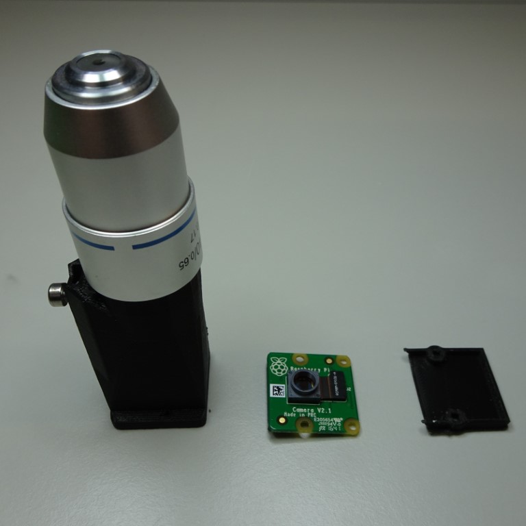 Attach the Raspberry Pi camera v2 to the bottom of the transmission optics module casing. Put the camera cover over the top. Secure everything in place with two M2x6mm screws using a 1.5mm hex screwdriver.