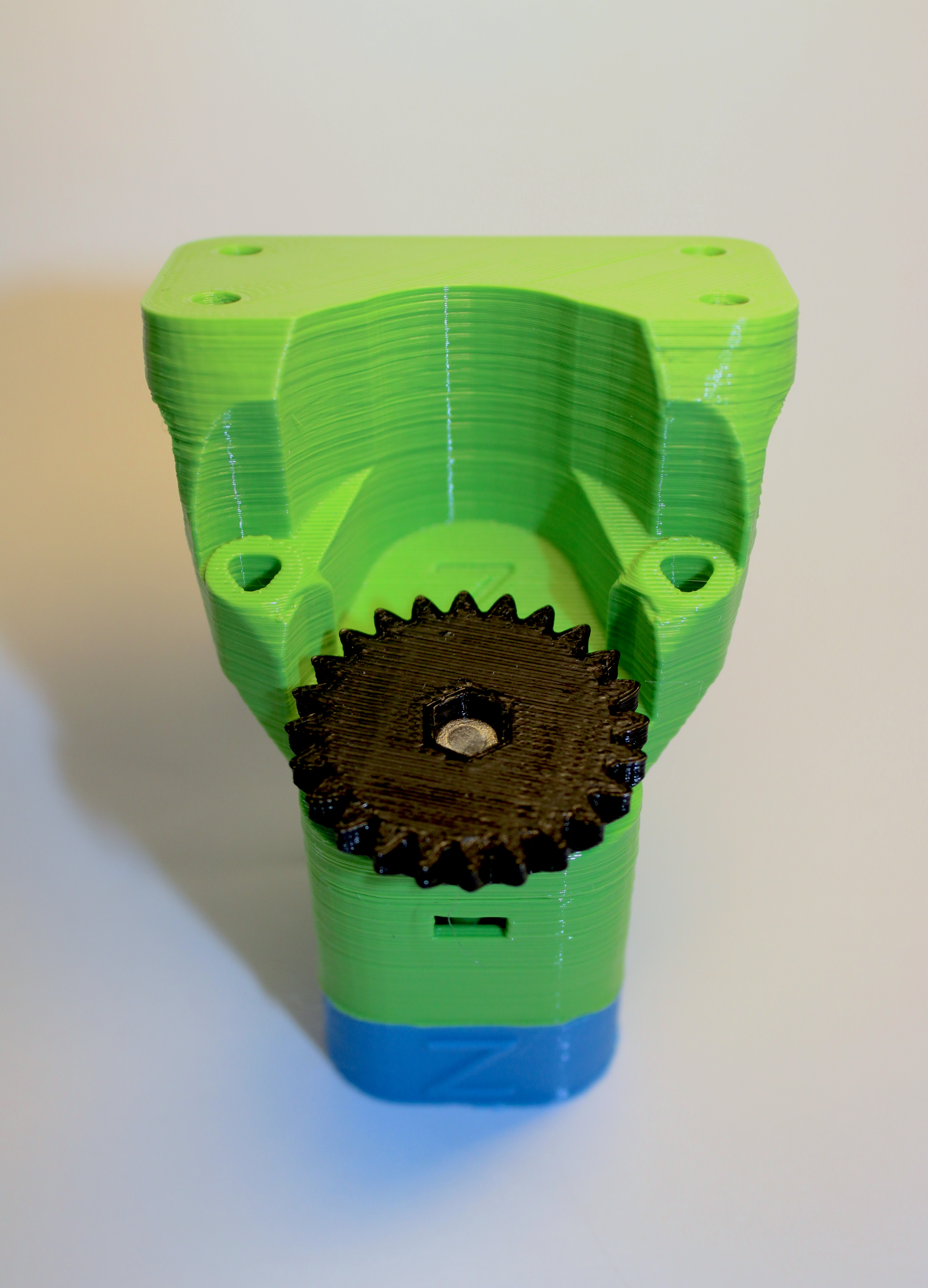 - Push it through one of the large gears and two washers