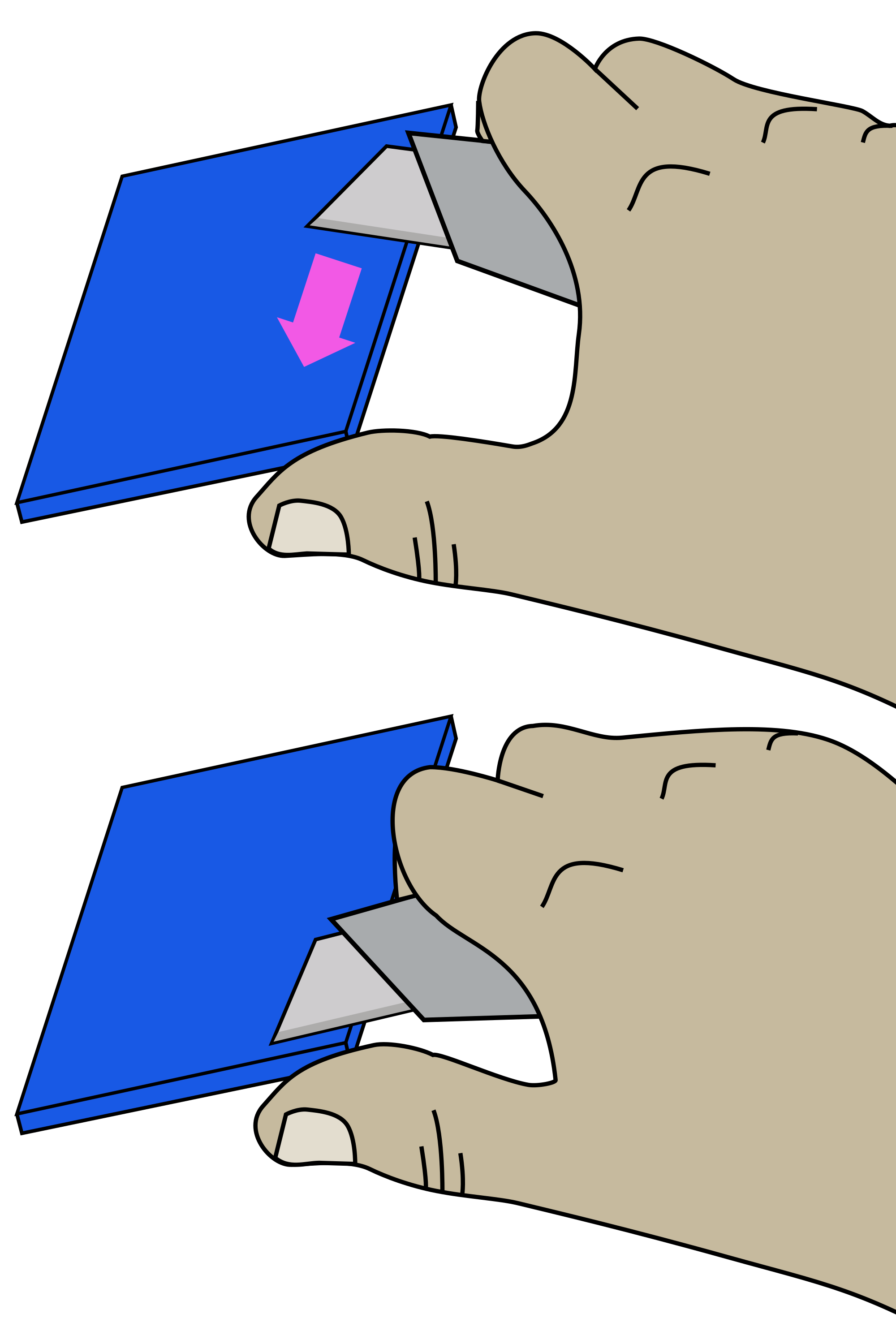 - Place blade on surface to be cut, and carefully close your dominant hand moving the blade, under control, towards your thumb.